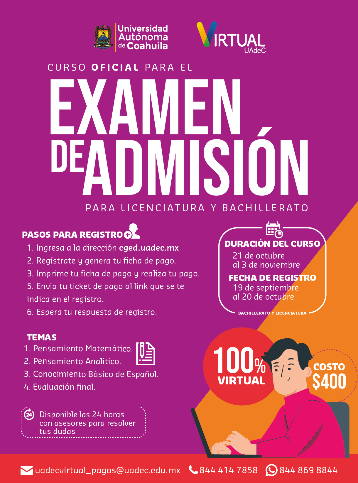 El curso se llevará a cabo del 21 de octubre al 3 de noviembre de 2022 y tanto para bachillerato como licenciatura tiene un costo de $400.00 pesos, para llevar a cabo el registro los interesados deberán de ingresar a http://www.cged.uadec.mx/cursodepreparacion/, registrar sus datos y generar la boleta de pago.