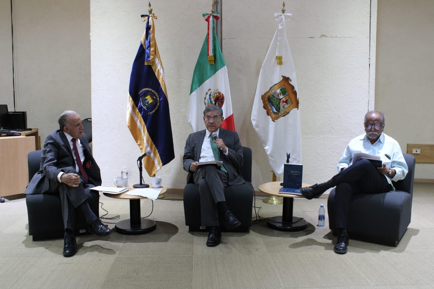 Los comentarios estuvieron a cargo del rector Salvador Hernández Vélez, y del docente de la Facultad de Ciencias Políticas y Sociales, Miguel Ángel Saucedo Lozoya, asistieron la coordinadora de la Unidad Torreón, Sandra López Chavarría, comunidad docente y estudiantil, para conocer la obra de quien es también Maestro Ad Vitam de la UAdeC.