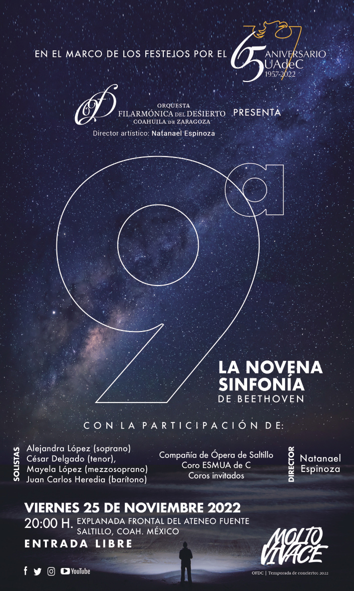 Señalaron que el evento se llevará a cabo el 25 de noviembre de 2022 a las 20:00 horas en la explanada frontal de la Escuela de Bachilleres Ateneo Fuente y la entrada será libre, donde la Filarmónica del Desierto presentará la obra magna de la música occidental, en un montaje para 200 artistas en escena entre instrumentistas y coro.