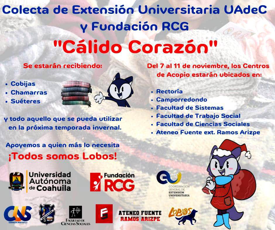 SALTILLO, Coahuila. 8 de noviembre de 2022. La Universidad Autónoma de Coahuila a través de la Coordinación General de Extensión Universitaria, y en colaboración con Fundación RCG, invitan a la comunidad universitaria, y público en general a sumarse a la campaña de donación “Cálido Corazón” los días 7 al 11 de noviembre.