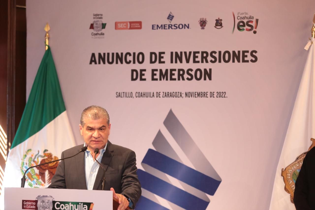Junto a los alcaldes de Ramos Arizpe y de Arteaga, José María Morales Padilla y Ramiro Durán García, respectivamente; el Secretario de Economía del Estado, Claudio Bres Garza; René Cabrera, Director de Operación de Emerson para México y Latinoamérica, así como del Director de Proyectos de la Planta Arteaga, Michael de Luna, informó de la determinación de Emerson de seguir en nuestro territorio.