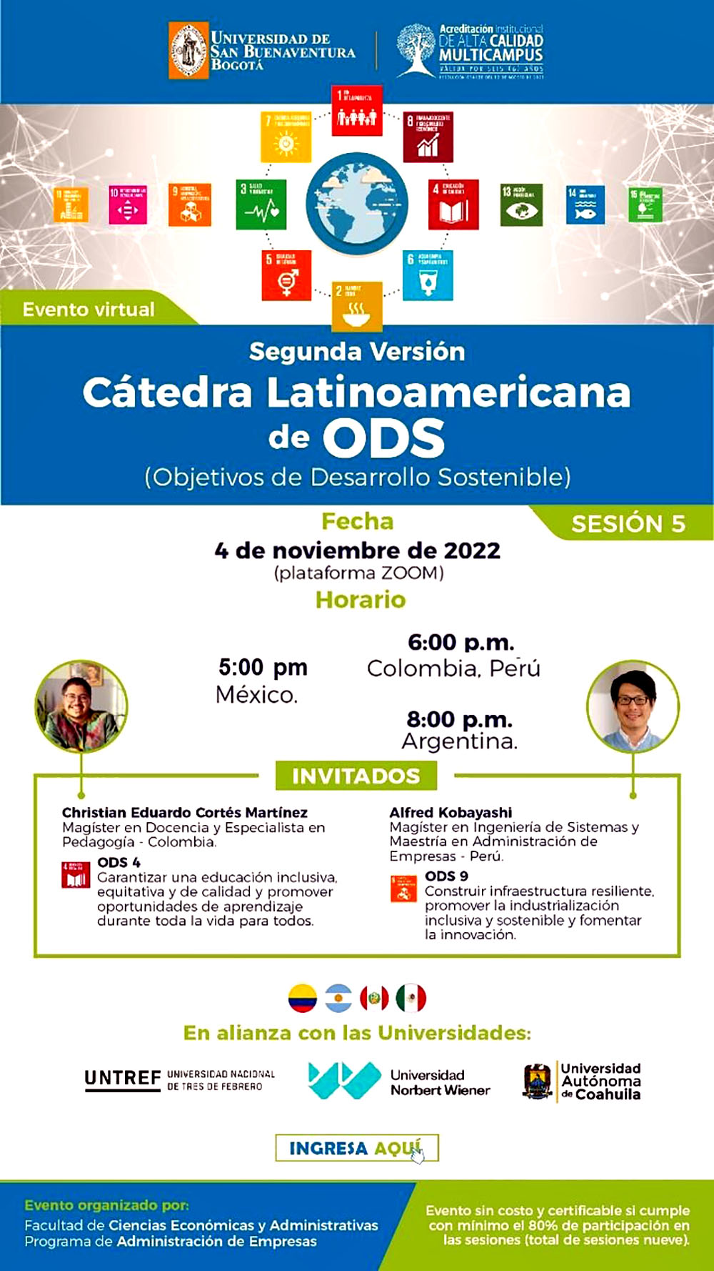 En esta quinta sesión se estarán abordando los ODS 4, el cual busca garantizar una Educación inclusiva, equitativa y de calidad, y promover Oportunidades de aprendizaje durante toda la vida para todos; a cargo de Christian Eduardo Cortés Martínez, maestro en Docencia y especialista en Pedagogía de Colombia.