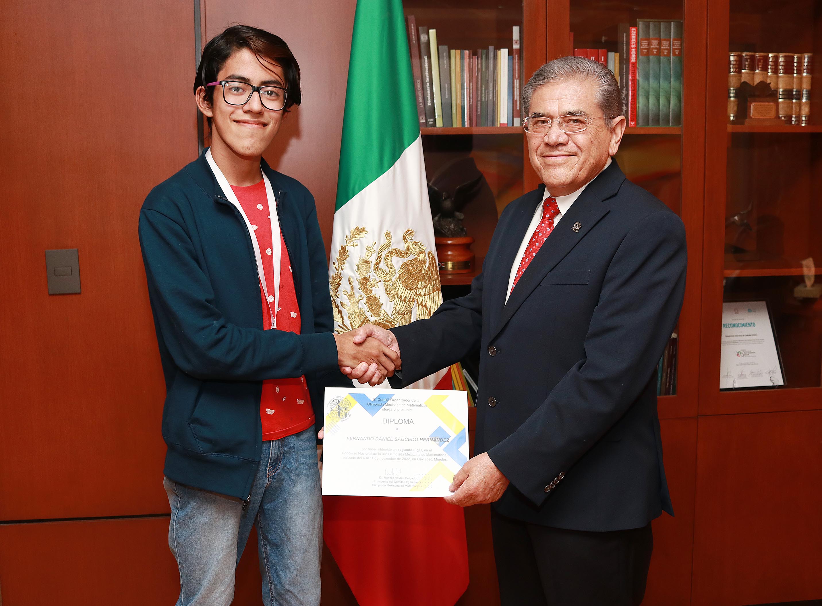 El rector Salvador Hernández Vélez recibió en su despacho al alumno Fernando Daniel Saucedo Hernández, reunión durante la cual lo felicitó por este logro obtenido, al tiempo que lo exhortó a seguir esforzándose para que cumpla sus metas académicas y personales.