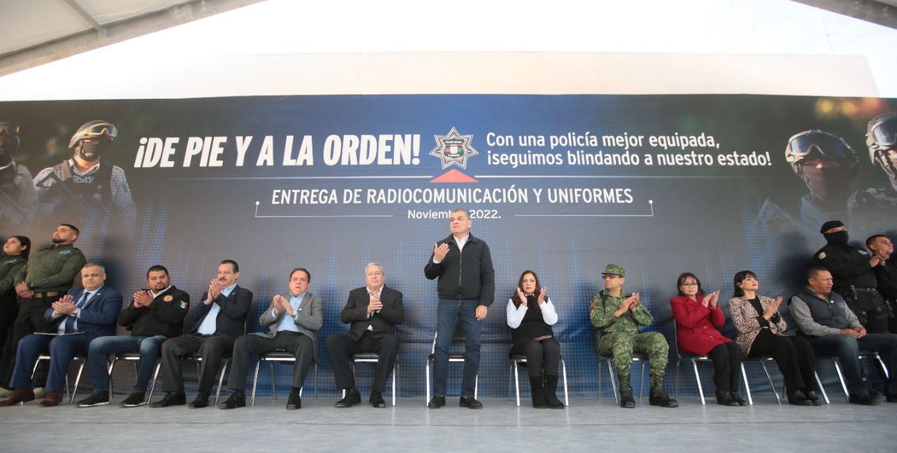 Saltillo, Coahuila de Zaragoza; a 23 de Noviembre de 2022.-Con una inversión de más de 101 millones de pesos, el gobernador Miguel Ángel Riquelme Solís entregó equipo de radiocomunicación y uniformes a las corporaciones de seguridad de Coahuila, en evento en el que, de igual manera, el Estado recibió la certificación e insignia "Triple Arco", de la Comisión de Acreditación para las Agencias de Aplicación de la Ley (CALEA).