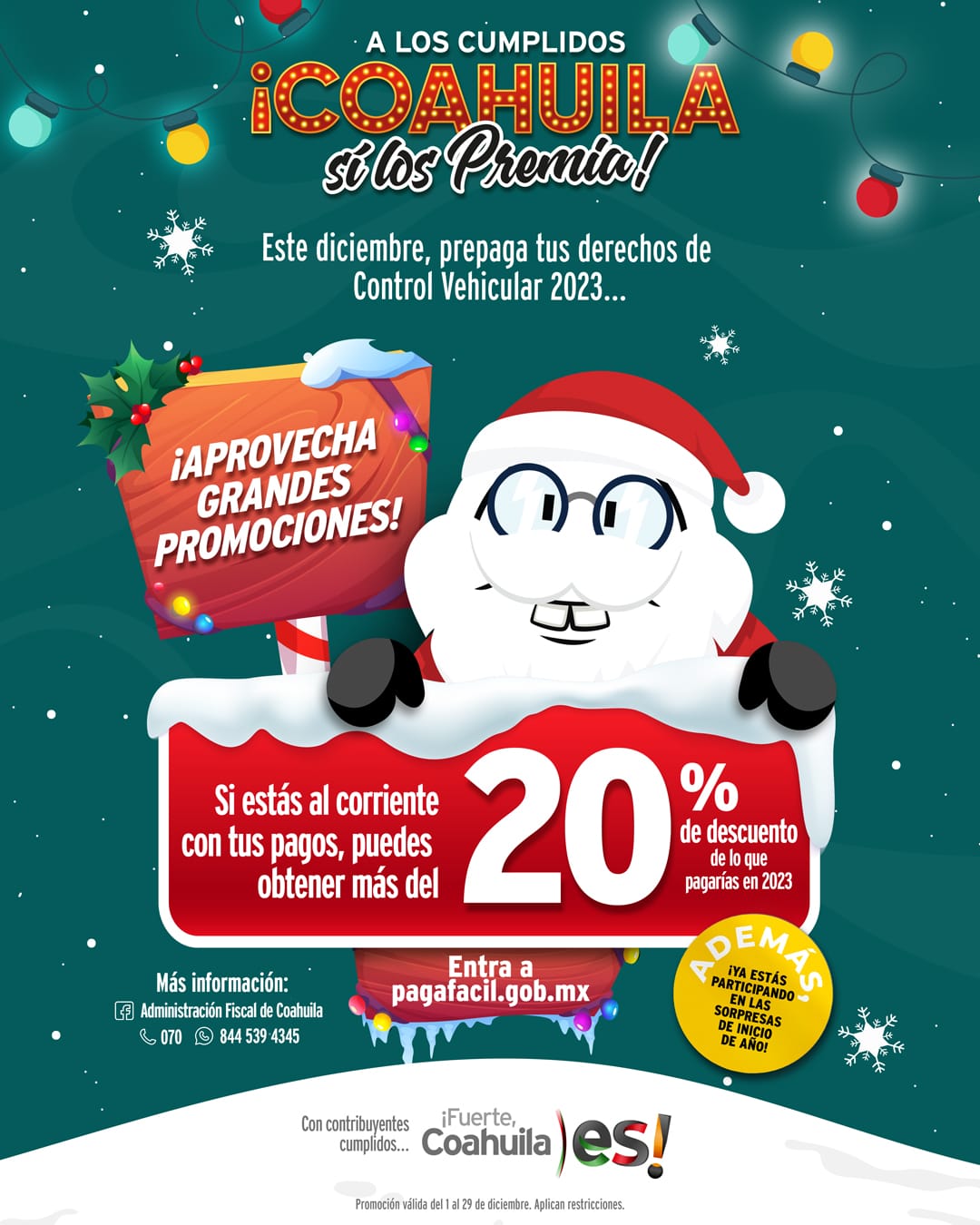 "A los cumplidos, Coahuila sí los premia, por lo que los invitamos a que aprovechen está promoción que estará disponible hasta el 29 de diciembre, y puedan iniciar el próximo año al corriente en sus derechos de control vehicular".