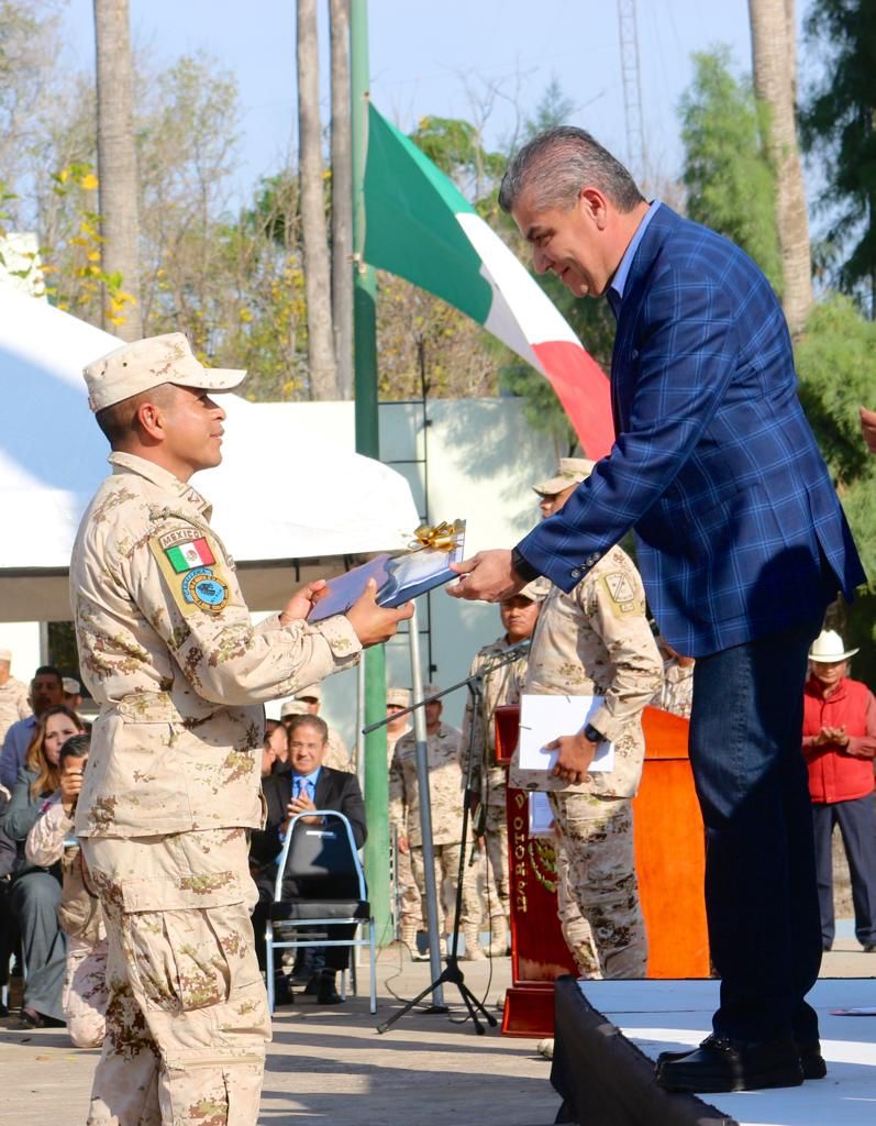 El Mandatario estatal acompañó al Comandante de la 11 Región Militar, general Eufemio Alberto Ibarra Flores; al Comandante de la 47ª Zona Militar, general José Fausto Torres Sánchez; y al Comandante del 26º Regimiento de Caballería Motorizado, coronel Julio César Guadarrama Reza, así como la Alcaldesa de Piedras Negras, Norma Treviño Galindo.
