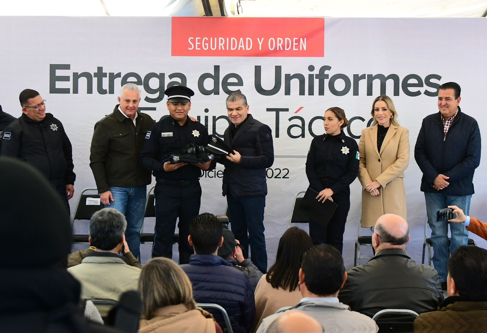 Torreón, Coahuila de Zaragoza; a 19 de Diciembre de 2022.- Como parte del reforzamiento de las acciones para mantener la paz y la seguridad en el estado, el gobernador Miguel Ángel Riquelme Solís entregó uniformes y equipo táctico a los elementos de la Dirección Municipal de Seguridad Pública (DSPM) de Torreón, con una inversión de 15 millones de pesos.
