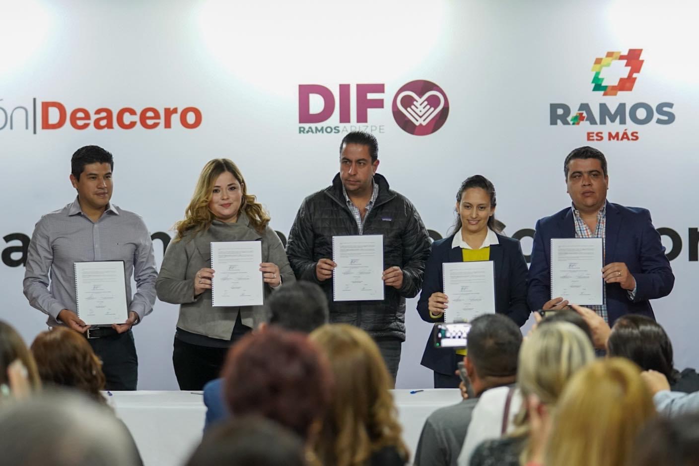 El alcalde Chema Morales Padilla; la presidenta honoraria del DIF Ramos Arizpe, Ana Lucía Cavazos Cuéllar y el secretario del Ayuntamiento, Alejandro González Farías, encabezaron la firma del convenio junto con Alicia Núñez Carreón, gerente de Fundación DeAcero, y Adán Montes Ramírez, jefe de Proyectos Comunitarios de dicha agrupación.