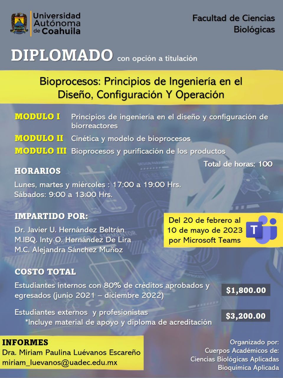 El Curso que es organizado por los Cuerpos Académicos de Ciencias Biológicas Aplicadas y Bioquímica Aplicada iniciará el 20 de febrero y concluye el 10 de mayo de 2023, se impartirá por la plataforma Microsoft Teams y además será una opción de titulación para los alumnos de la Facultad de Ciencias Biológicas.