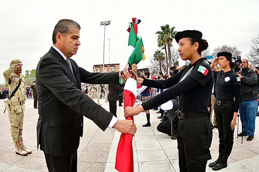 Acompañado de los Generales Eufemio Alberto Ibarra Flores, Comandante de la 11 Región Militar, y Fidel Mondragón Rivero, Comandante de la 47 Zona Militar, así como la Presidenta Municipal de Piedras Negras, Norma Treviño González, el Gobernador de Coahuila rindió lo honores al Lábaro Patrio y tomó protesta a escoltas de instituciones educativas.