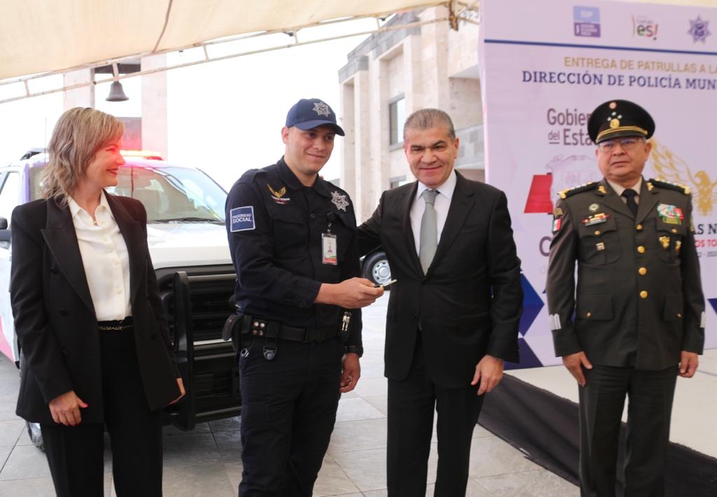 La entrega de patrullas a elementos de Seguridad Pública se realizó en la explanada de la Presidencia Municipal, y asistieron Sonia Villarreal Pérez, Secretaria de Seguridad Pública del Estado; Gerardo Márquez Guevara, Fiscal General del Estado; General Eufemio Alberto Ibarra Flores, Comandante de la 11 Región Militar; General Fidel Mondragón Rivero, Comandante de la 47 Zona Militar; Coronel de Caballería DEM Marcos Hernández Vielma, Comandante del 12 Regimiento de Caballería Motorizado; Manuel Alejandro Velazco Villanueva, Coordinador Estatal de la Guardia Nacional, y representantes de diversos sectores de la comunidad.
