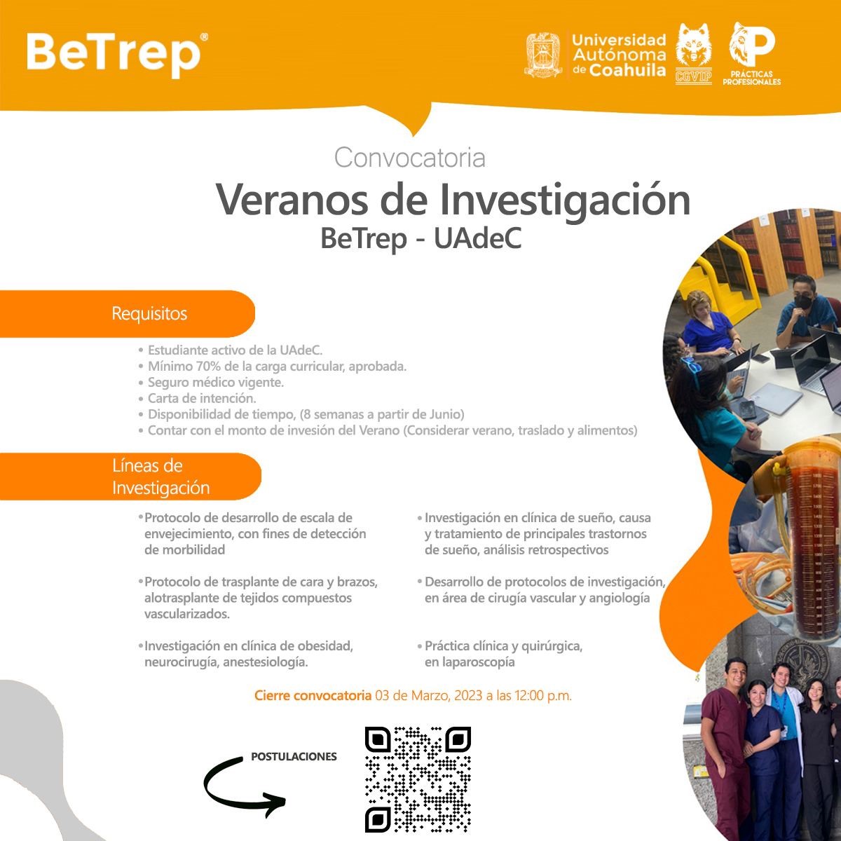 SALTILLO, Coahuila. 1 de marzo de 2023. La Universidad Autónoma de Coahuila a través de la Coordinación General de Vinculación e Innovación Productiva, convoca a su comunidad estudiantil del área médica o afín, a participar en la segunda edición de "Veranos de Investigación BeTrep - UAdeC".