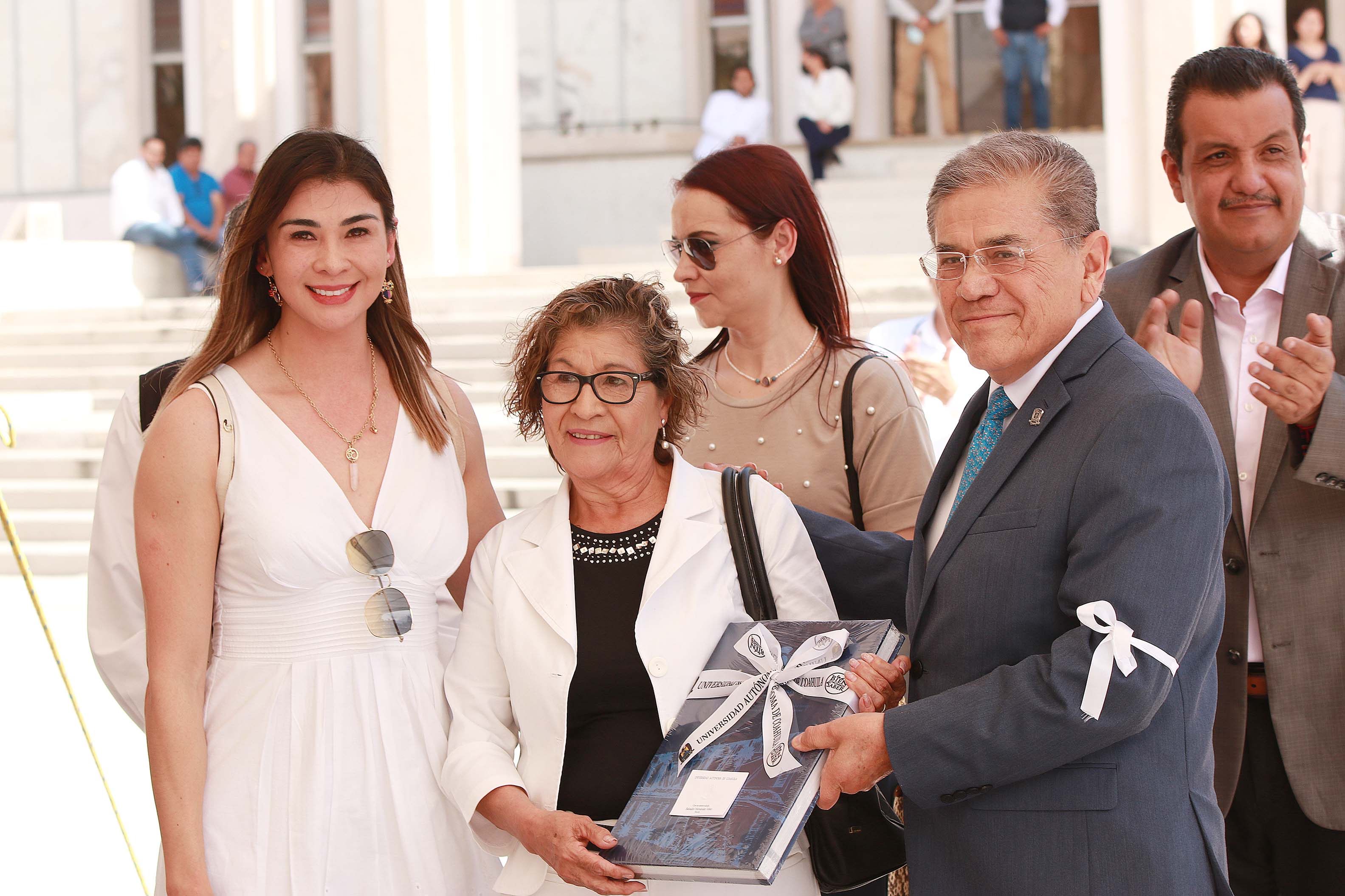 En la ceremonia los colaboradores del Departamento de Resguardo Institucional realizaron una guardia de honor y se brindó un minuto de aplausos para Don Enrique Martínez, además el rector Salvador Hernández Vélez le entregó a Magda Cervantes el libro conmemorativo del 60 aniversario de la UAdeC.