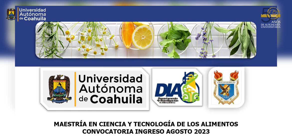 SALTILLO, Coahuila. 13 de marzo de 2023. La Universidad Autónoma de Coahuila a través de la Facultad de Ciencias Químicas Unidad Saltillo, convoca a egresados en Química, Biología, Ingeniería Química, Bioquímica, Agronomía, Biotecnología y áreas afines, a cursar la Maestría en Ciencia y Tecnología de Alimentos, cuyas clases inician en agosto 2023.