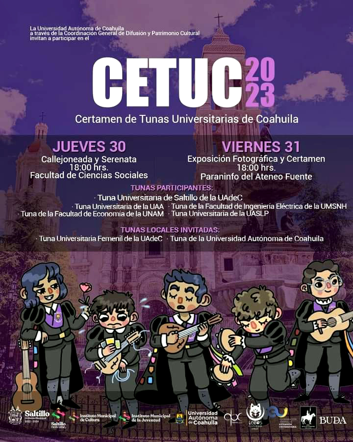 SALTILLO, Coahuila. 23 de marzo de 2023. La Universidad Autónoma de Coahuila a través de la Coordinación de Difusión y Patrimonio Cultural y la Tuna Universitaria de Saltillo, invitan a la comunidad universitaria y público en general a participar en el Certamen de Tunas Universitarias de Coahuila (CETUC) 2023 que se realizará los días 30 y 31 de marzo.