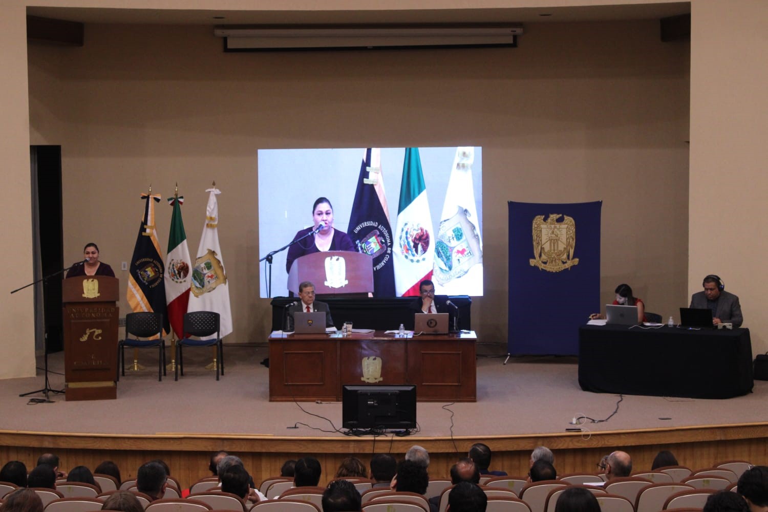 En el Centro Cultural “Braulio Fernández Aguirre” en Ciudad Universitaria de Torreón y a través de Microsoft Teams, presidida por el rector Salvador Hernández Vélez y el secretario general, Miguel Ángel Rodríguez Calderón, con la asistencia presencial y virtual de 267 Consejeros de las Unidades Saltillo, Torreón y Norte, la presidenta de la Academia de Directoras y Directores de la Unidad Saltillo y directora de la Facultad de Enfermería, Dra. Eva Kerena Hernández Martínez, presentó el documento.