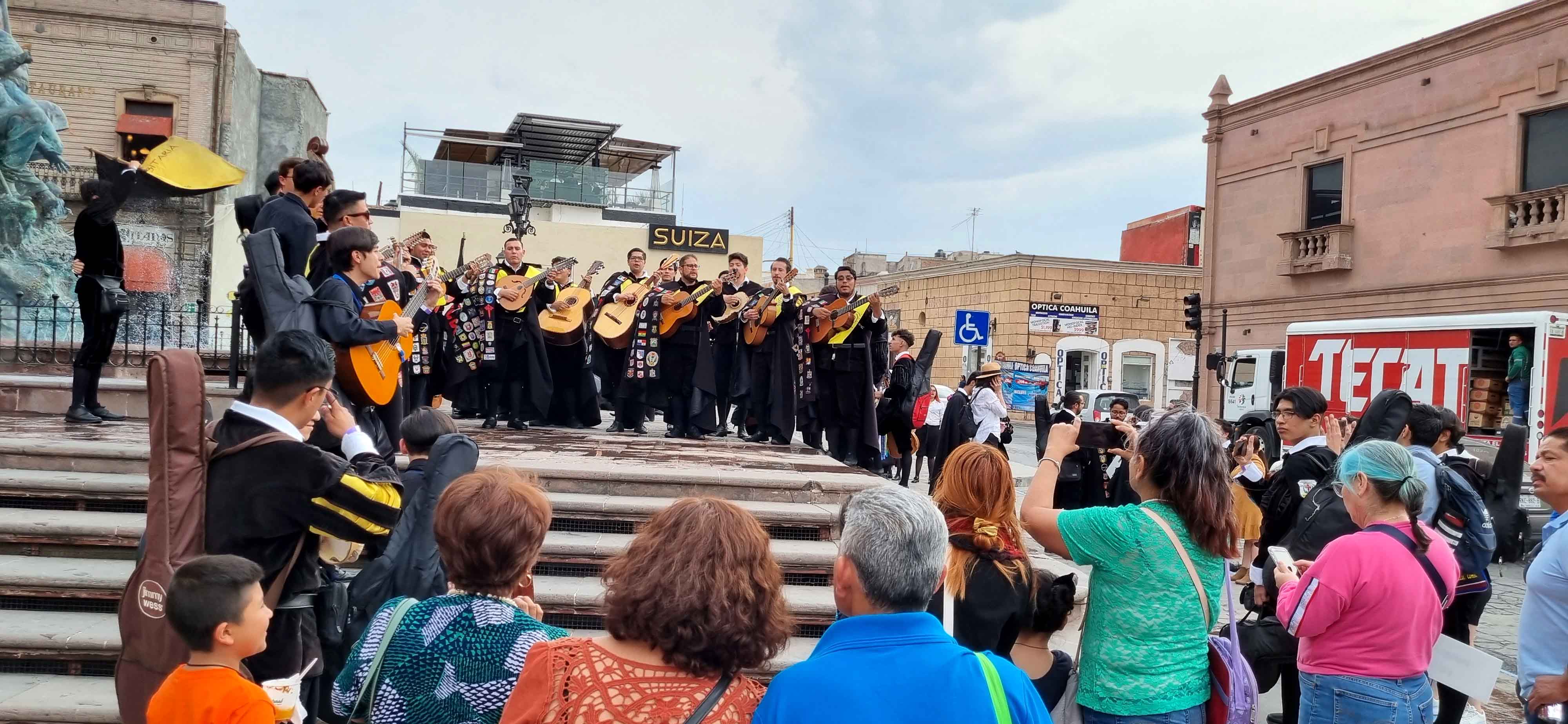 Después del recorrido que inició en la Plaza de la Nueva Tlaxcala hacia la Plaza de Armas de Saltillo, las tunas participantes deleitaron al público asistente con una ronda de serenatas en el patio de la Facultad de Ciencias Sociales, ubicada en la calle Benito Juárez 139, en el Centro Histórico.