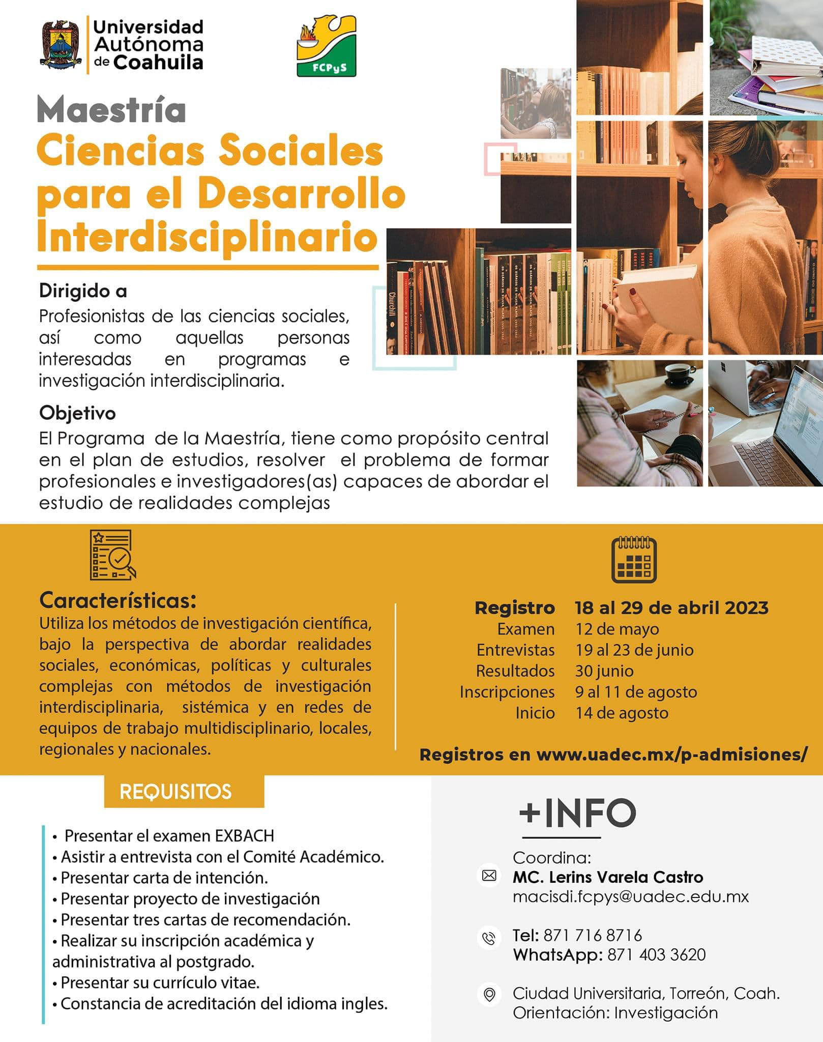 TORREÓN, Coahuila. 17 de abril de 2023. La Universidad Autónoma de Coahuila a través de la Facultad de Ciencias Políticas y Sociales de la Unidad Torreón, ofrece la Maestría en Ciencias Sociales para el Desarrollo Interdisciplinario, para ingresar en el semestre agosto-diciembre 2023, la inscripción deberá de realizarse en www.uadec.mx/admisiones/.