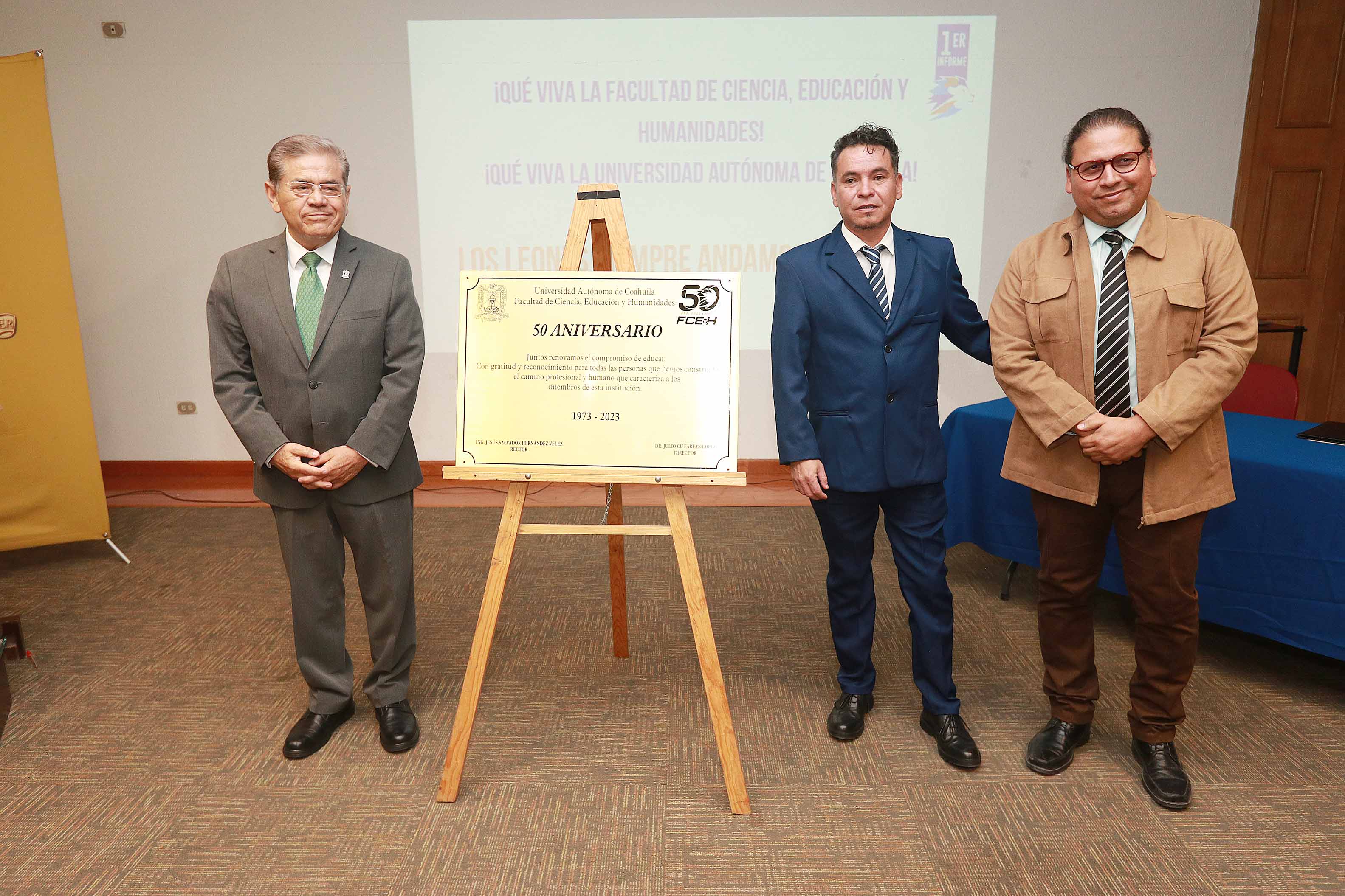 Por último, se develó una placa conmemorativa por el 50 aniversario de la Facultad con la que se da comienzo oficialmente con la celebración, en gratitud y reconocimiento para todas las personas que han construido el camino profesional y humano que caracteriza a los miembros de la Facultad de Ciencia, Educación y humanidades.
