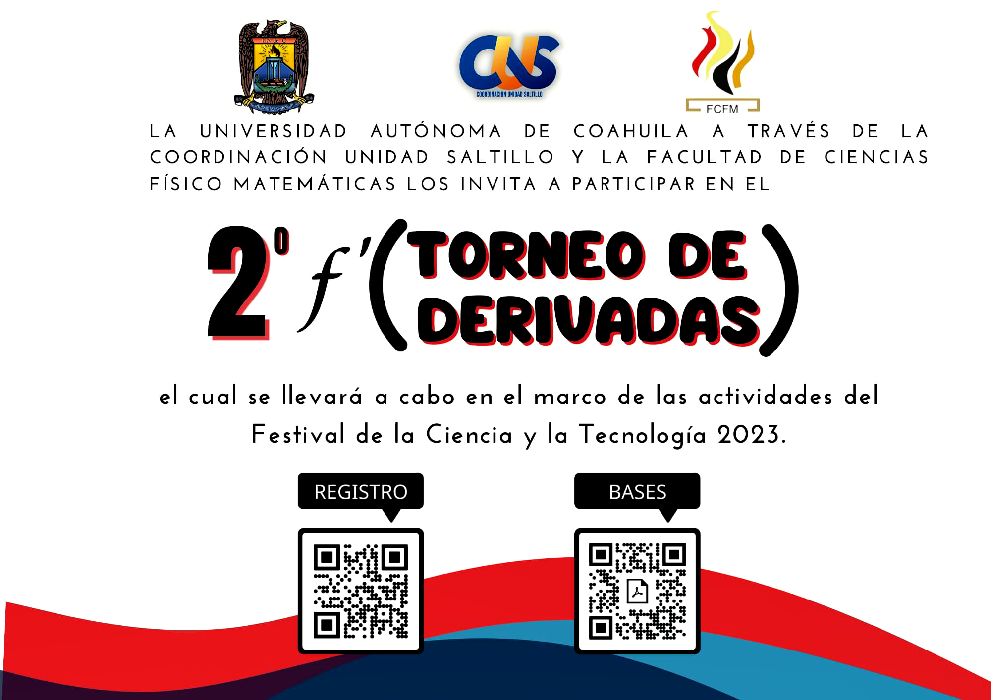 SALTILLO, Coahuila. 12 de mayo de 2023. La Universidad Autónoma de Coahuila a través de la Coordinación Unidad Saltillo (CUS) y de la Facultad de Ciencias Físico Matemáticas (FCFM), invitan a la comunidad estudiantil de la Unidad Saltillo a participar en el Cuarto Torneo de Integrales y en el Segundo Torneo de Derivadas, en el marco del Festival de la Ciencia y la Tecnología 2023 organizado por la Facultad.