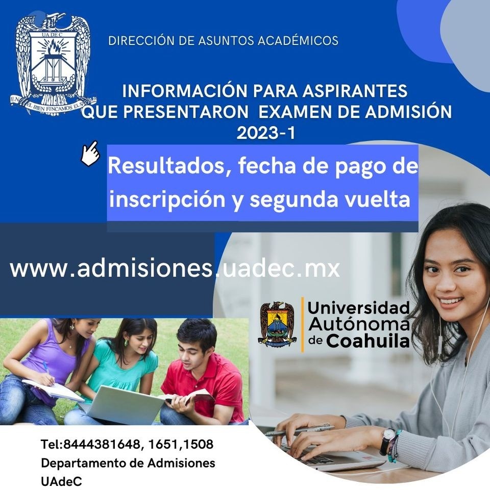 SALTILLO, Coahuila. 16 de mayo de 2023. La Universidad Autónoma de Coahuila a través del Departamento de Admisiones de la Dirección de Asuntos Académicos, convoca a los aspirantes de nuevo ingreso de nivel bachillerato y licenciatura a revisar el 21 de mayo los resultados del examen de admisión, y en caso de no pasar, registrarse en la Segunda Vuelta para tener una nueva oportunidad y cursar sus estudios en la UAdeC para el periodo agosto-diciembre 2023.
