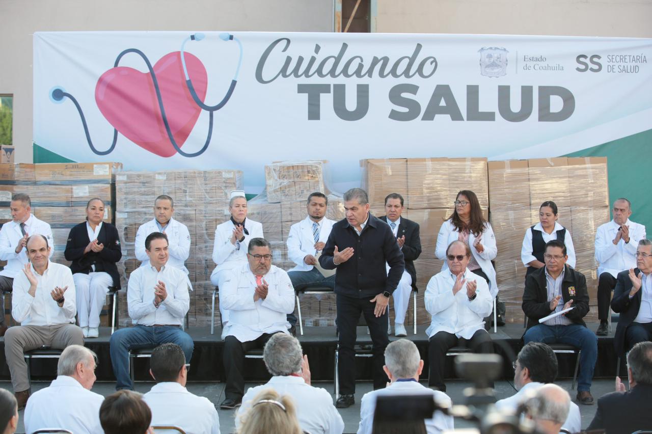 Saltillo, Coahuila de Zaragoza; a 18 de Mayo de 2023.- El gobernador Miguel Ángel Riquelme Solís entregó medicamentos e insumos al sector salud de la entidad, evento en el que reiteró su gratitud y reconocimiento al personal médico por su entrega, dedicación y, sobre todo, por los esfuerzos extraordinarios para afrontar los retos de salud pública.