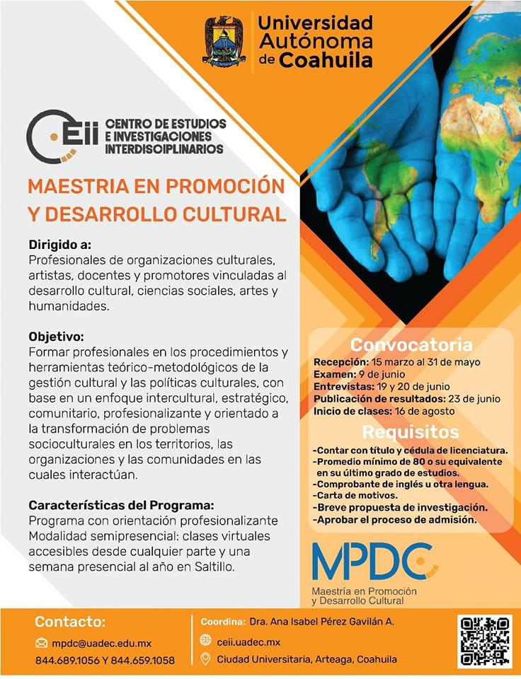 SALTILLO, Coahuila. 25 de mayo de 2023. A los profesionales de organizaciones culturales, funcionarios, docentes, y promotores culturales, vinculados al desarrollo cultural, ciencias sociales, artes y humanidades, se les convoca a cursar la Maestría en Promoción y Desarrollo Cultural que ofrece el Centro de Estudios e Investigaciones Interdisciplinarias (CEII) de la Universidad Autónoma de Coahuila.