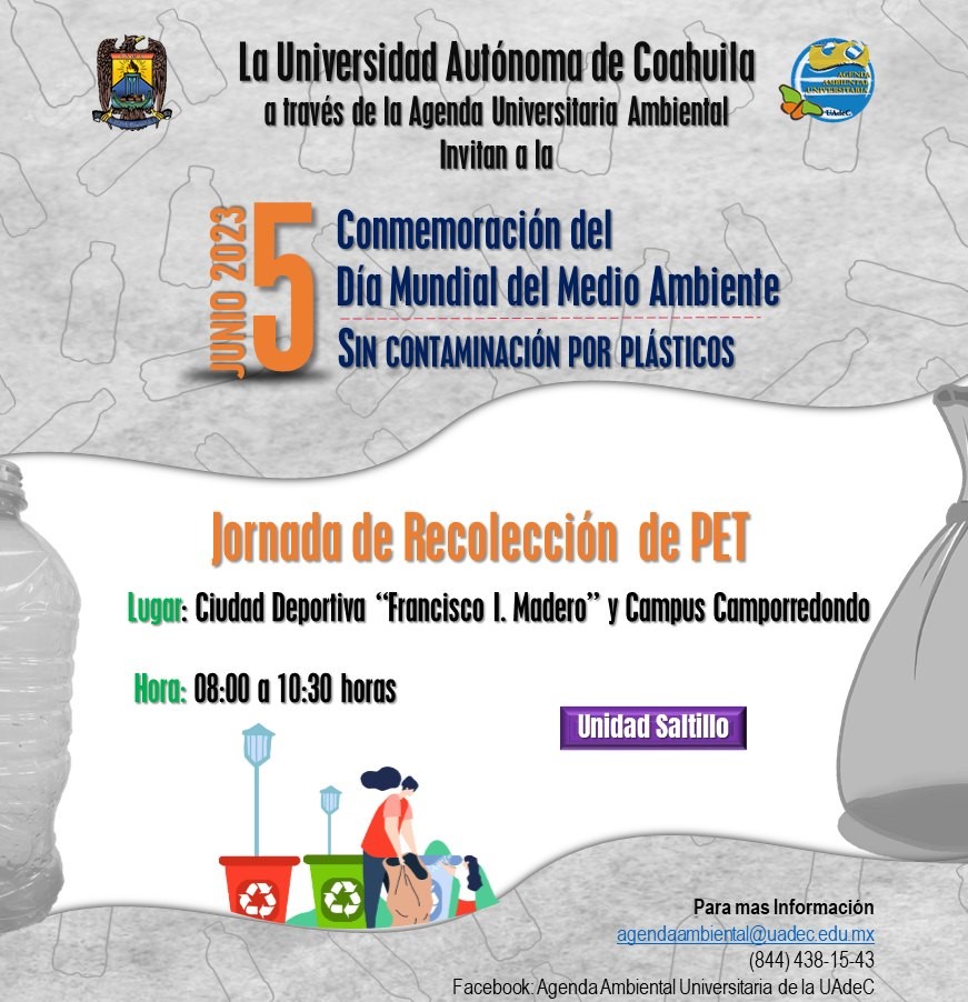 El día 5 de junio de 8:30 a 10:30 horas se realizará una Jornada de limpieza de PET en Ciudad Deportiva “Francisco I. Madero” y Campus Camporredondo en la Unidad Saltillo; mientras que, en la Unidad Norte a la misma hora se llevará a cabo en el Parque Ecológico Recreativo y Educativo de la UAdeC, teniendo como punto de reunión la cancha sintética de futbol.
