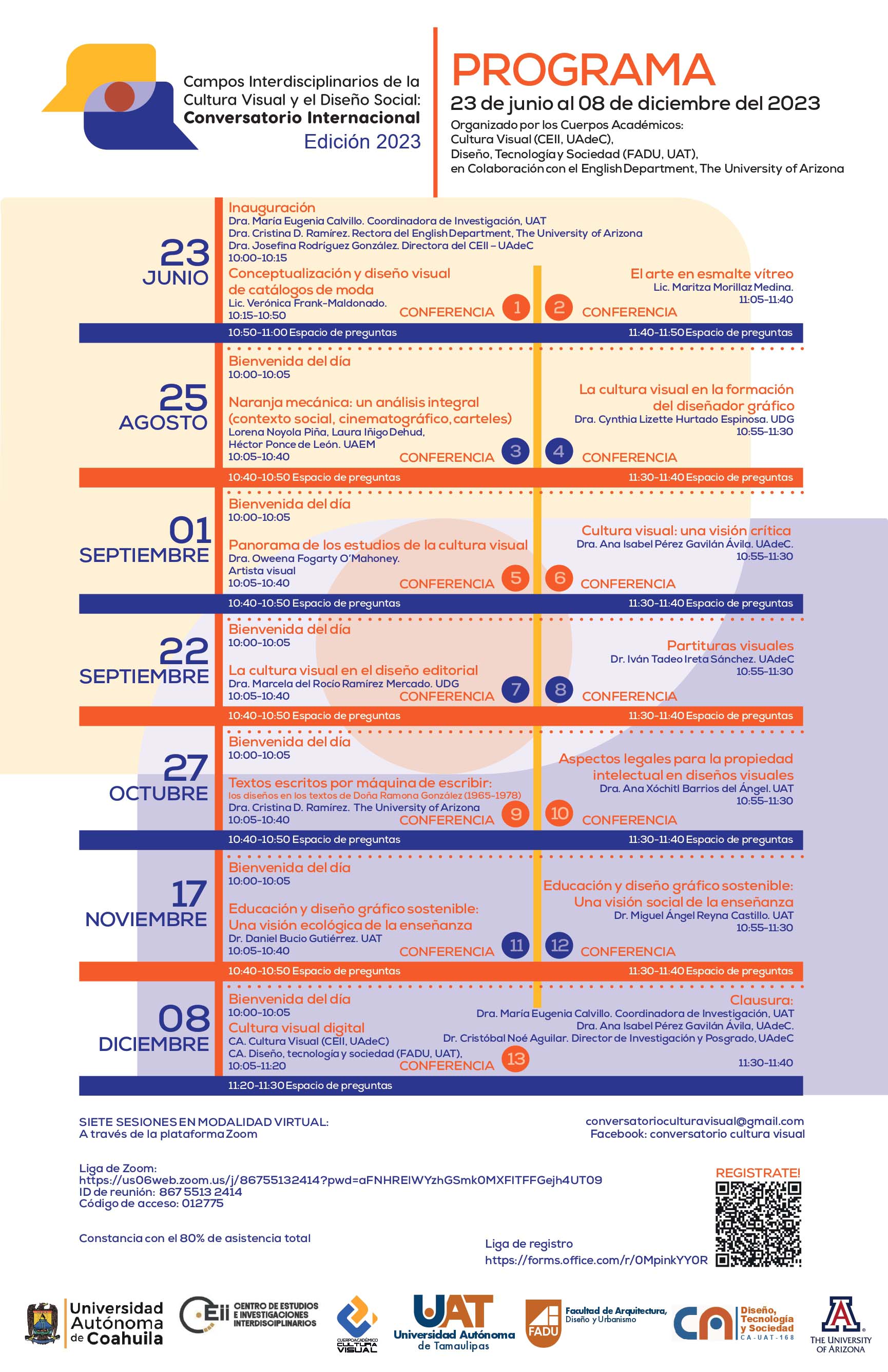 El conversatorio dividido en siete sesiones, es organizado en conjunto con el CA “Diseño, Tecnología y Sociedad” de la Facultad de Arquitectura y Diseño y Urbanismo de la Universidad Autónoma de Tamaulipas y el Department of English de The University of Arizona, el cual está dirigido a estudiantes, egresados y docentes que se desempeñan en diferentes esferas del diseño, las artes y las humanidades.