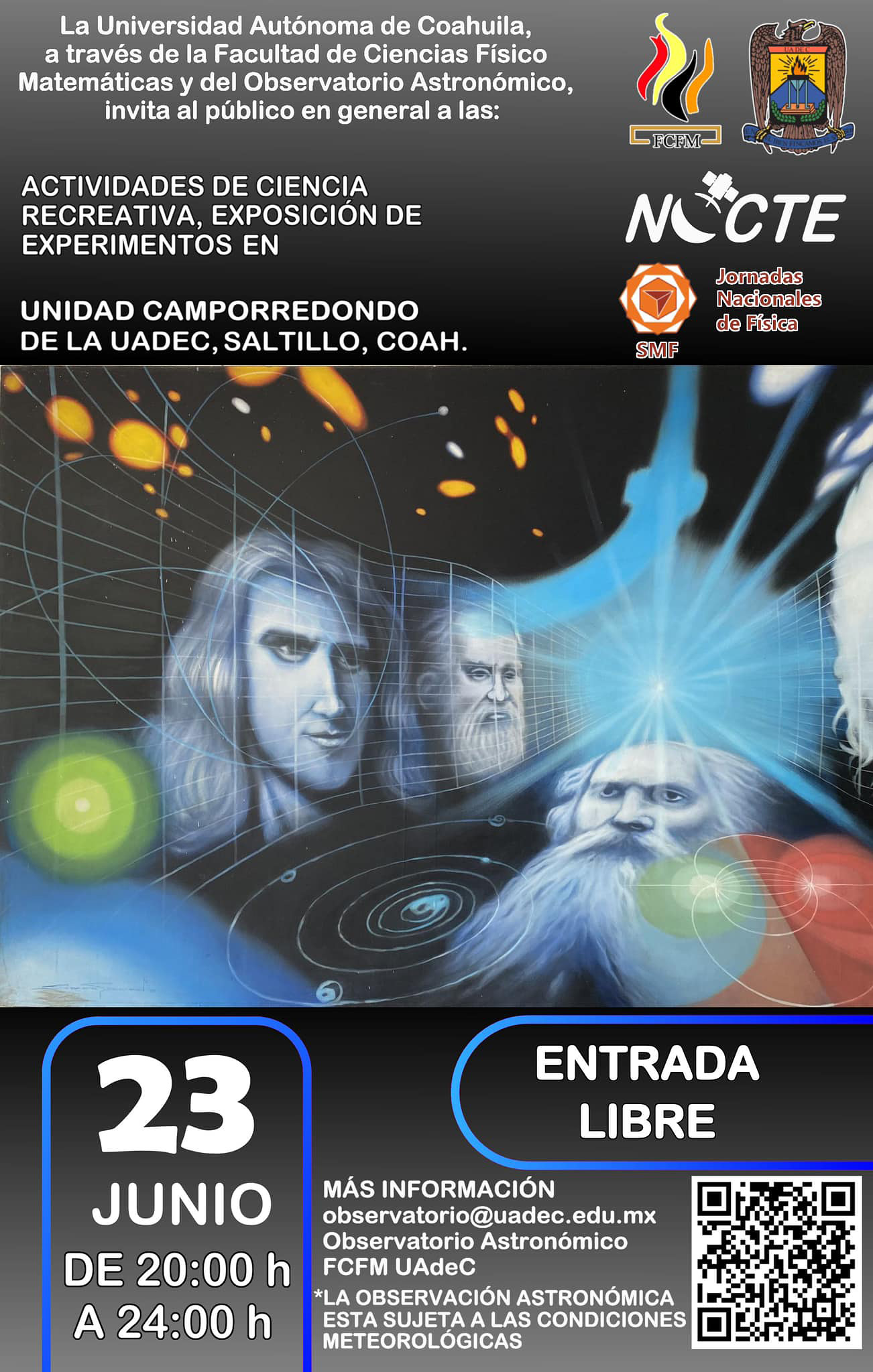 El evento estará sujeto a las condiciones meteorológicas, por lo que se exhorta a los interesados a visitar la página de Facebook @ObservatorioAstronómicoFCFM UAdeC, ya que de esta manera podrán enterarse de su posible cancelación, o comunicarse a los teléfonos (844) 4 14 47 39 y (844) 414-8869, o al correo Esta dirección de correo electrónico está siendo protegida contra los robots de spam. Necesita tener JavaScript habilitado para poder verlo..