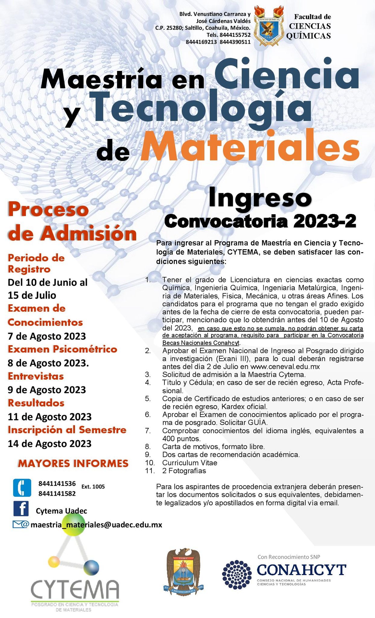 Para más información, visitar la página de Facebook https://www.facebook.com/cytema.uadec, comunicarse a los teléfonos (844) 114 15 36 y (844) 114 1528 o al correo Esta dirección de correo electrónico está siendo protegida contra los robots de spam. Necesita tener JavaScript habilitado para poder verlo..