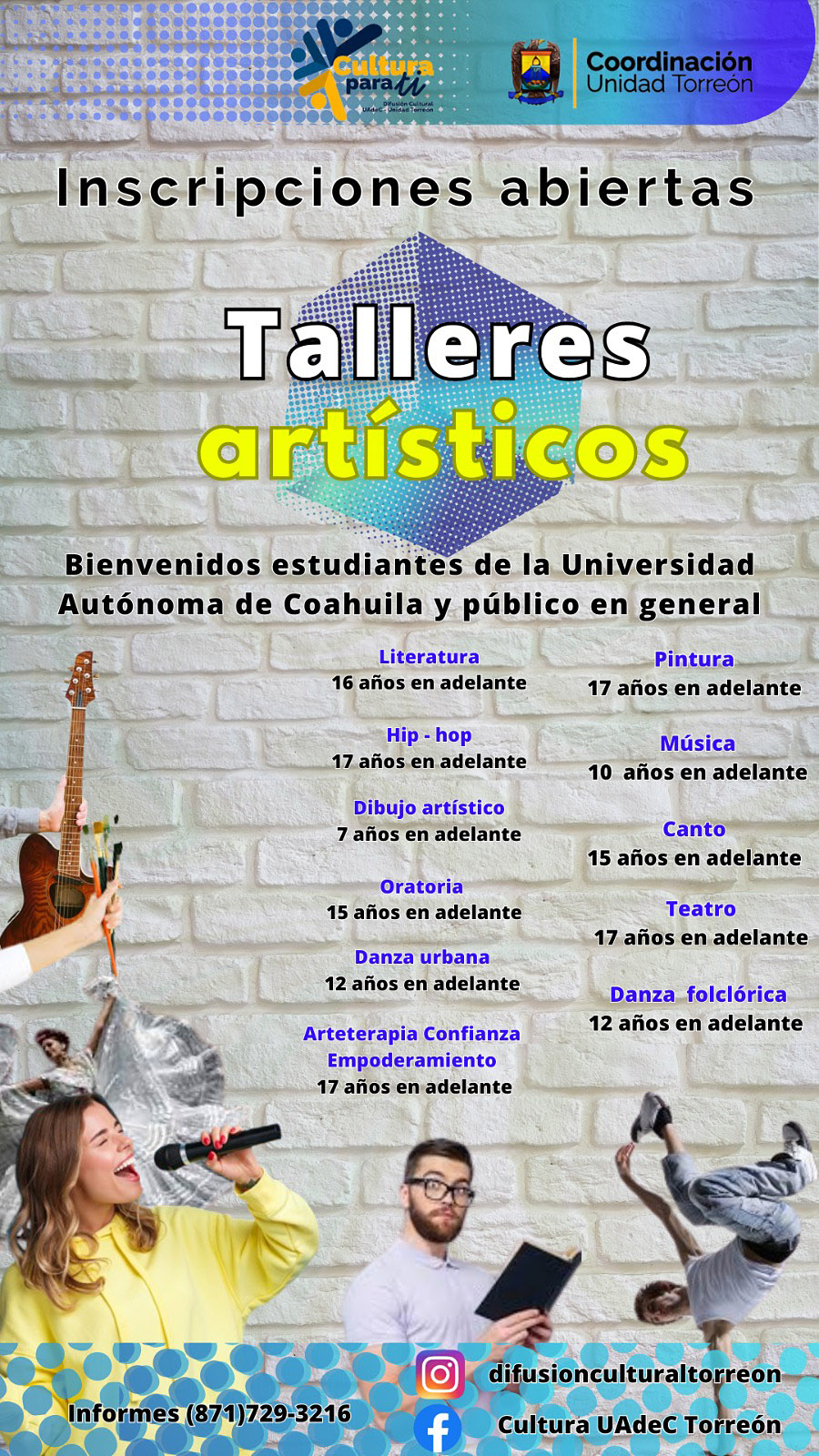 Además, se encuentran abiertas las inscripciones a los talleres que se impartirán en Grupos y Talleres en el Bulevar Venustiano Carranza #2143, Col. República, frente al edificio de Rectoría, llamar al teléfono (844) 412 54 27; así como, los del Recinto Cultural Universitario “Aurora Morales de López” en Ramos Arizpe #229 en el Centro Histórico de Saltillo, comunicarse al (844) 410 32 03 y los talleres culturales que ofrece la Coordinación General de Difusión y Patrimonio Cultural, escribir al WhatsApp (844) 692 44 02.