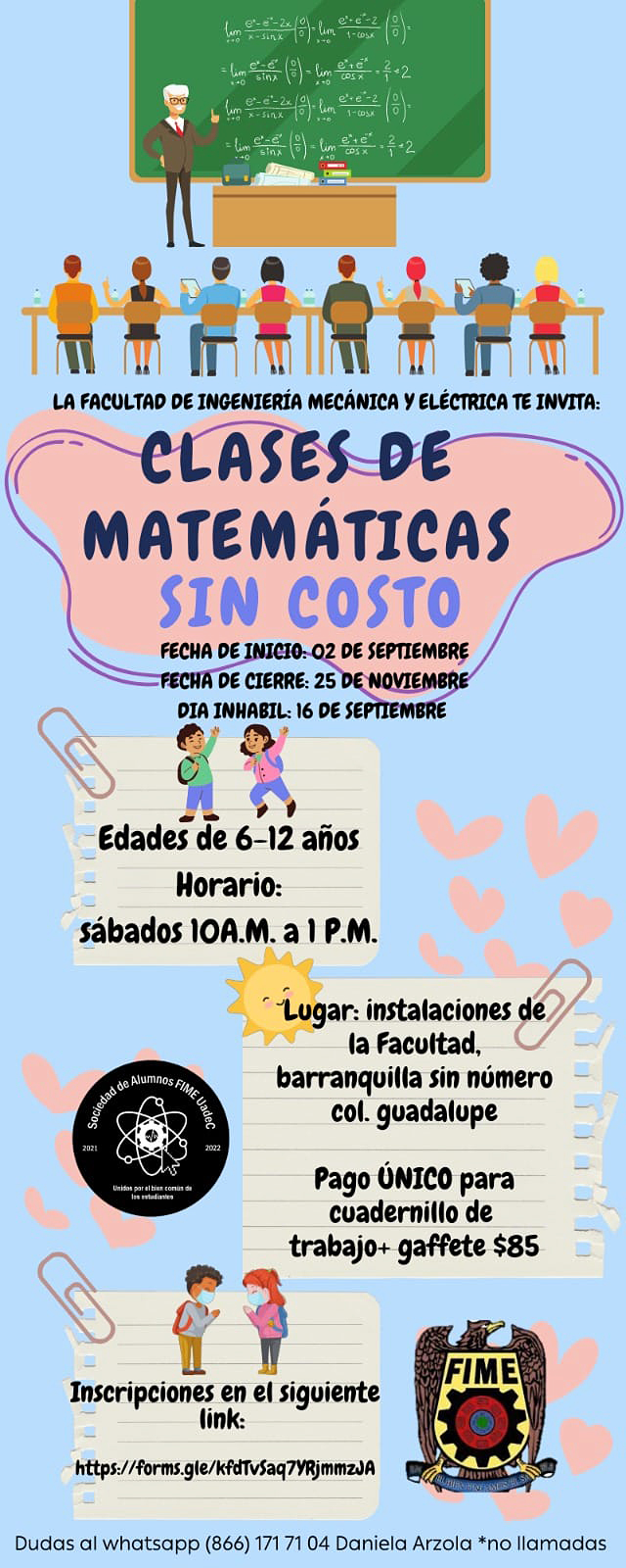 MONCLOVA, Coahuila. 29 de agosto de 2023. La Facultad de Ingeniería Mecánica y Eléctrica (FIME) de la Universidad Autónoma de Coahuila Unidad Norte, a través de su Sociedad de Alumnos invitan a niñas y niños de 6 a 12 años a inscribirse en las Clases de Matemáticas, las cuales iniciarán este 2 de septiembre en las instalaciones de la Facultad.