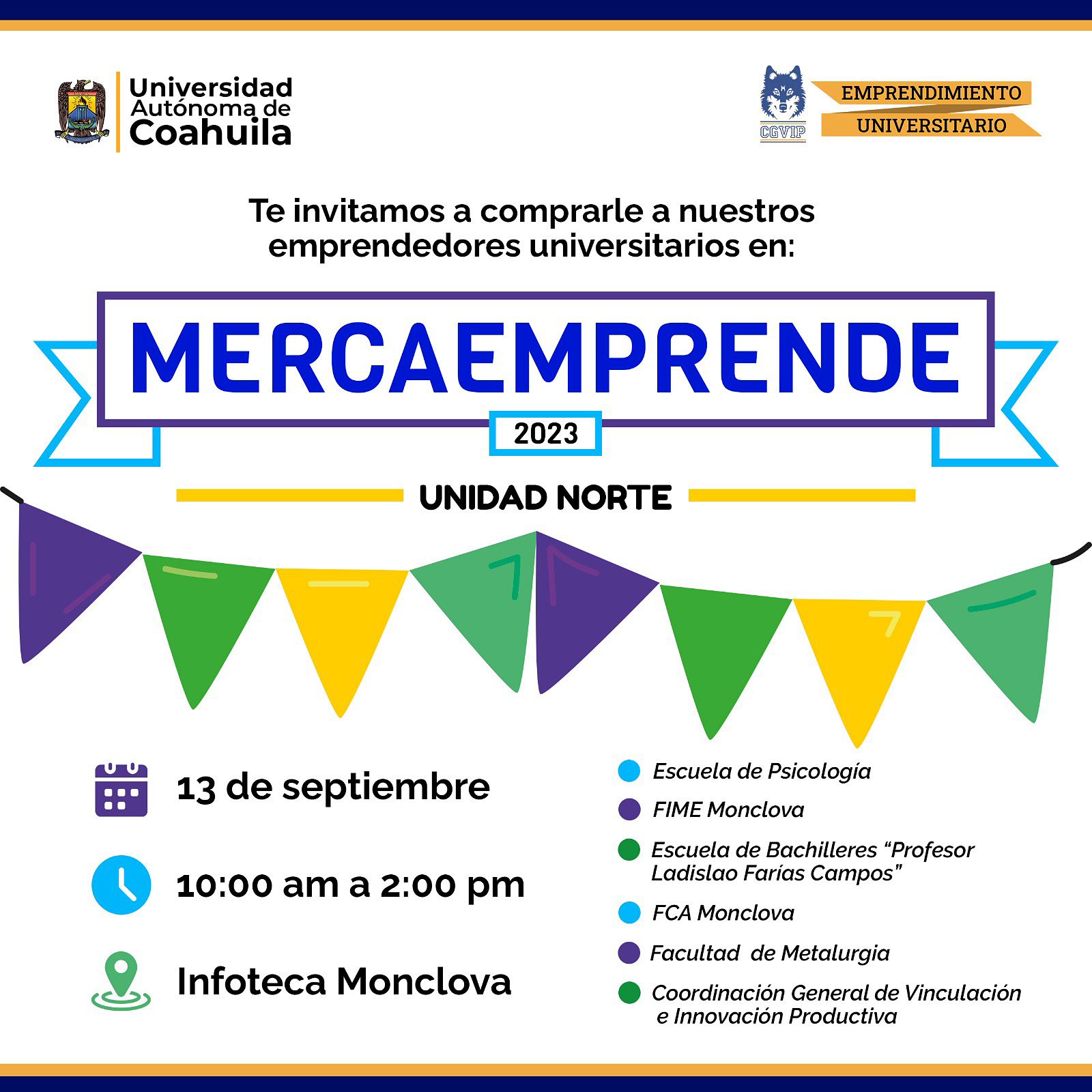 Para fomentar la diversificación de las actividades académicas y productivas en la región centro del estado, la CGVIP invita a la comunidad universitaria y al público en general a participar en "Merca Emprende", un evento que se llevará a cabo el 13 de septiembre en la Infoteca de la Unidad Norte de 10:00 a 14:00 horas.