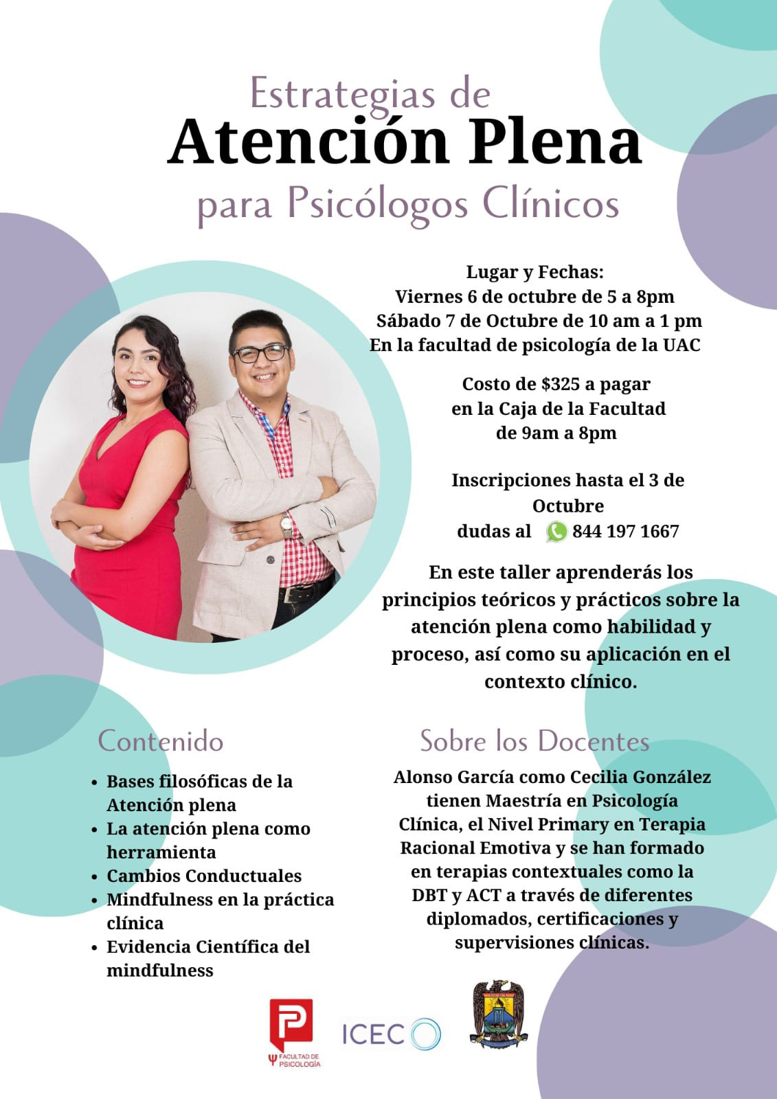 SALTILLO, Coahuila. 18 de septiembre de 2023. La Universidad Autónoma de Coahuila a través de la Facultad de Psicología Unidad Saltillo, en conjunto con el Instituto de Ciencias de la Emoción y la Conducta, invitan a participar en el Taller “Estrategias de Atención Plena para Psicólogos Clínicos”, que se llevará a cabo el 6 y 7 de octubre de 2023.