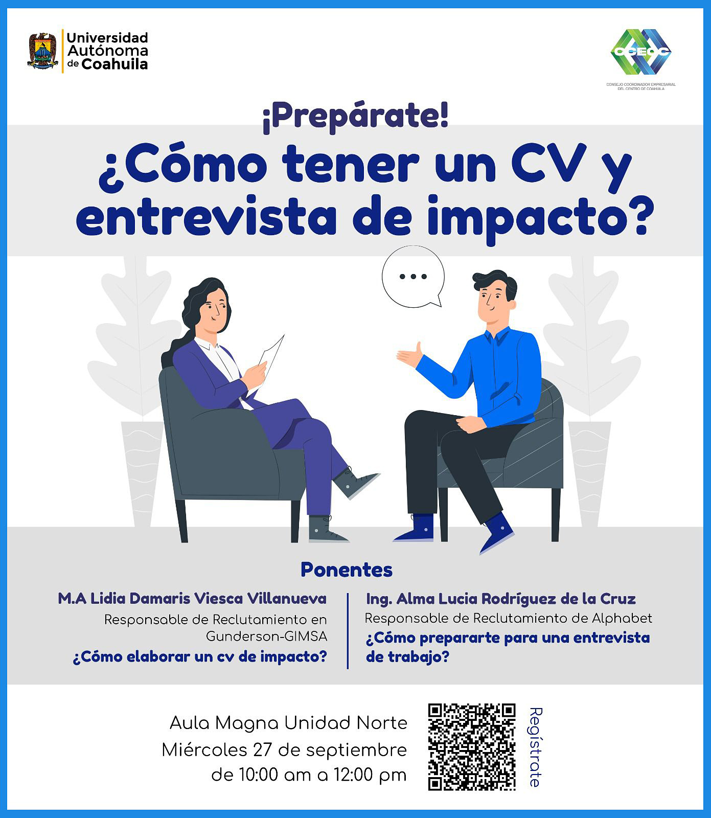 MONCLOVA, Coahuila. 26 de septiembre de 2023. La Universidad Autónoma de Coahuila a través de la Coordinación General de Vinculación e Innovación Productiva, en colaboración con el Consejo de Vinculación Universidad Empresa de Monclova, invitan al evento ¿Cómo tener un CV y Entrevista de impacto? Que se realizará este miércoles 27 de septiembre a las 10:00 horas, en el Aula Magna de la Unidad Norte (UN).