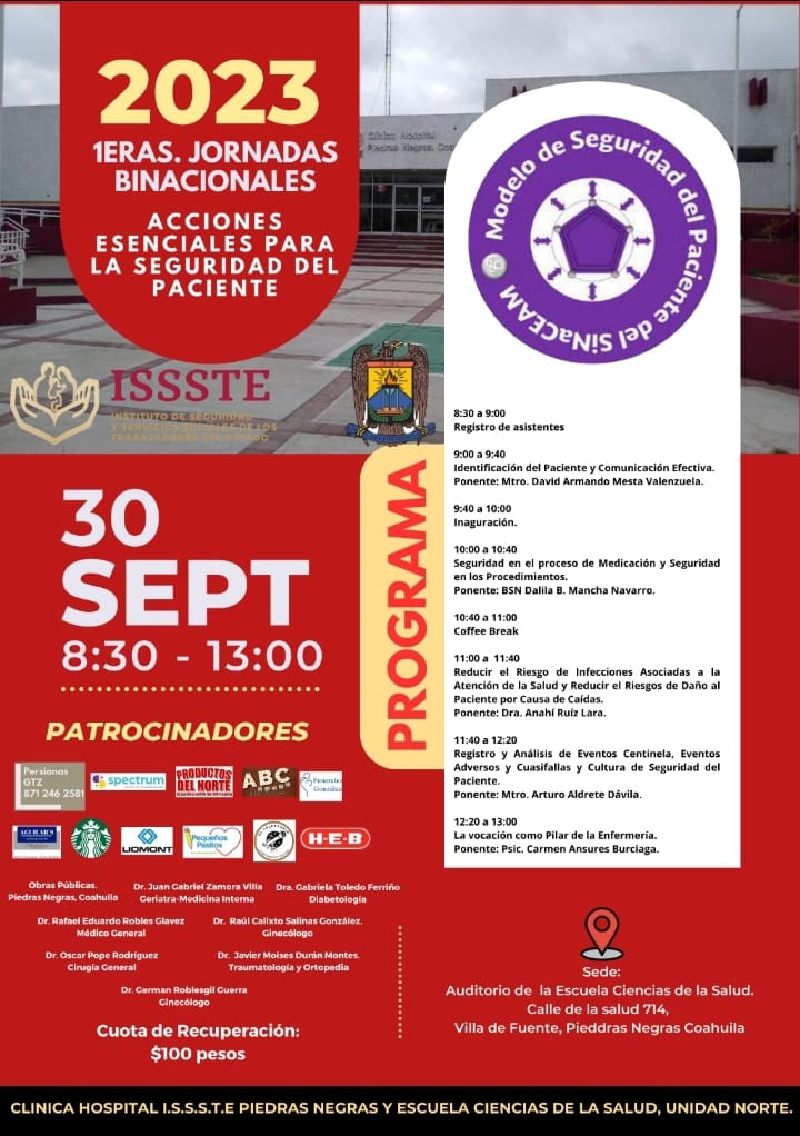 PIEDRAS NEGRAS, Coahuila. 27 de septiembre de 2023. La Universidad Autónoma de Coahuila a través de la Escuela de Ciencias de la Salud Unidad Norte en conjunto con el Instituto de Seguridad y Servicios Sociales de los Trabajadores del Estado (ISSSTE), invita a las Primeras Jornadas Binacionales “Acciones esenciales para la seguridad del paciente”, que se llevarán a cabo el 30 de septiembre de 2023.