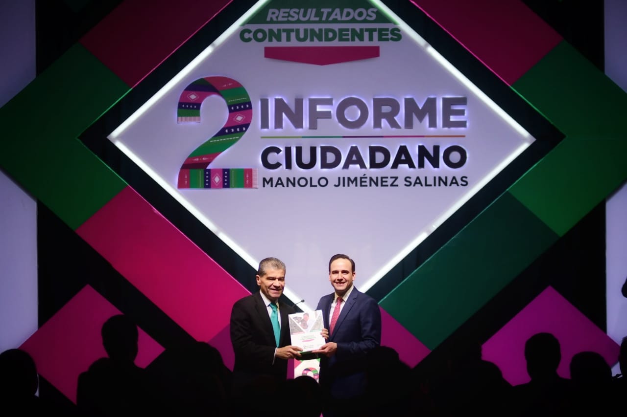 Por su parte, en su mensaje el alcalde Manolo Jiménez informó sobre el estado que guarda su Administración, y dio a conocer los logros más importantes durante el 2019, donde destacó el arranque de la megareforestación de un millón de árboles y la eliminación del uso de bolsas de plástico, además de resaltar que fue el año de las colonias y los barrios de Saltillo, donde se trabaja de manera permanente en las tareas de bacheo, recarpeteo, agua, drenaje y electrificación.