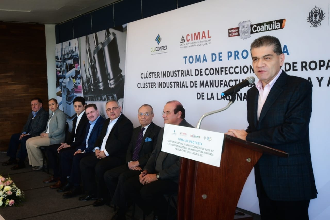Gómez Palacio, Durango; a 27 de Enero de 2020.- Los gobernadores de Coahuila, Miguel Ángel Riquelme Solís, y de Durango, José Rosas Aispuro Torres, tomaron protesta al Clúster Industrial de Confeccionistas de Ropa y al Clúster Industrial de Manufactura Avanzada y Automotriz de La Laguna.