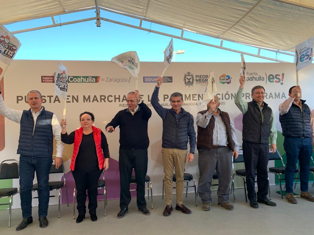 Piedras Negras, Coahuila de Zaragoza; a 27 de Febrero de 2020.- Con inversión de 32.8 millones de pesos del Impuesto Sobre Nómina (ISN), el gobernador Miguel Ángel Riquelme Solís dio el banderazo de inicio de las obras de pavimentación en Piedras Negras, donde anunció que en 2020 se invertirán cerca de 400 millones de pesos con aportaciones del Estado y Municipio.