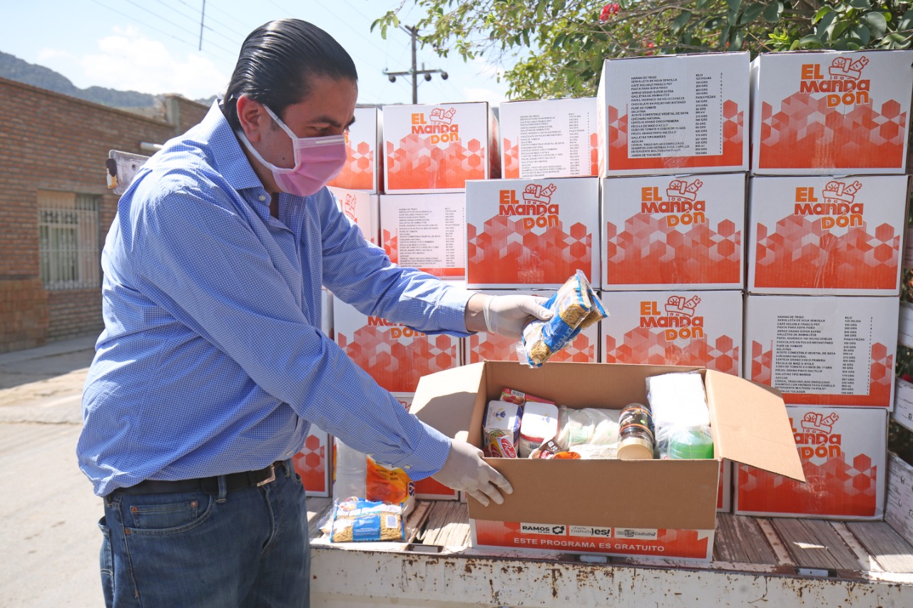 1 de abril del 2020 Ramos Arizpe, Coahuila de Zaragoza. El alcalde Chema Morales acudió a la congregación Santo Domingo para hacer entrega de 85 mandadones a las familias que ahí habitan, a través de este programa mensualmente se entregan 2890 súper despensas, con un total de 22 productos de la canasta básica y que llega a los 80 ejidos del campo de Ramos Arizpe.