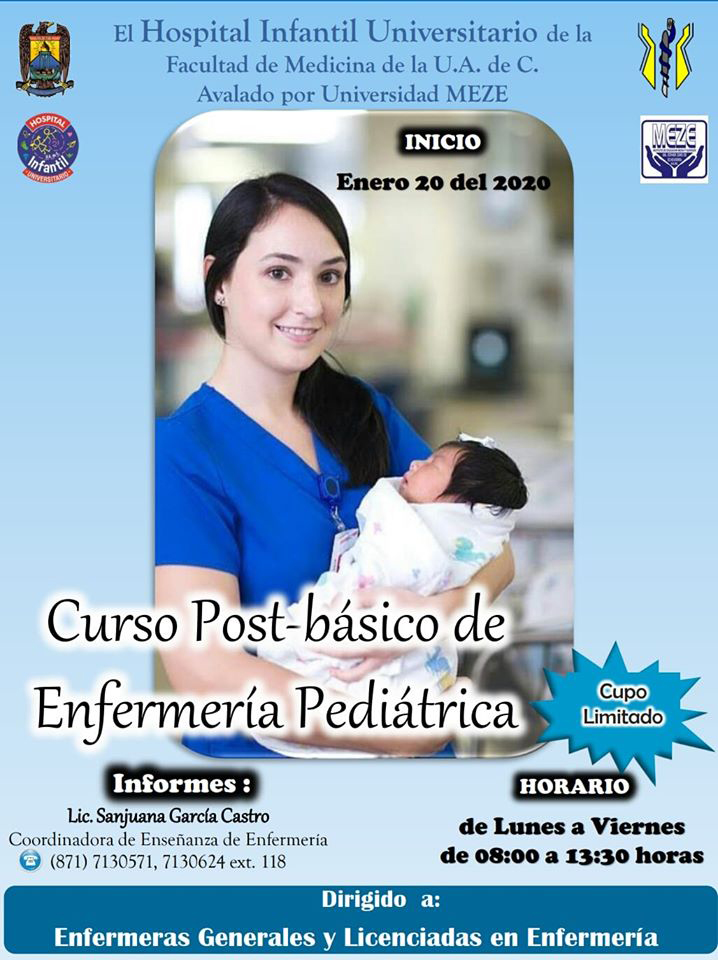 TORREÓN Coahuila; 12 de noviembre de 2019.- El Hospital Infantil Universitario y la Facultad de Medicina Unidad Torreón de la Universidad Autónoma de Coahuila, invitan a tomar el curso post-básico de Enfermería Pediátrica.