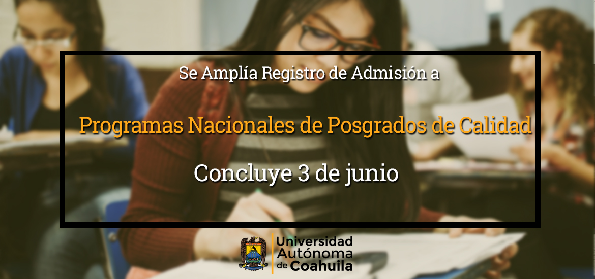 SALTILLO, Coahuila; 04 de mayo de 2020.- La Dirección de Investigación y Posgrado y la Dirección de Asuntos Académicos de la Universidad Autónoma de Coahuila, abren periodo extemporáneo de registro para posgrados pertenecientes al Programa Nacional de Posgrados de Calidad PNPC a partir de la fecha y hasta el 3 de junio, para el semestre agosto-diciembre de 2020.