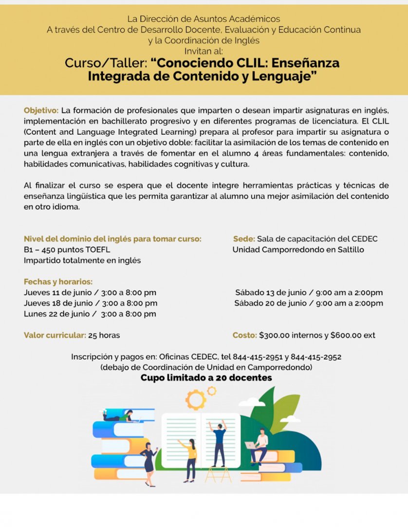 SALTILLO, Coahuila; 08 de abril de 2020.- A través del Centro de Desarrollo Docente, Evaluación y Educación Continua y la Coordinación de Inglés, la Dirección de Asuntos Académicos de la Universidad Autónoma de Coahuila invita al curso-taller "Conociendo CLIL: Enseñanza Integrada de Contenido y Lenguaje" para los profesionales que imparten o desean impartir asignaturas en inglés en bachillerato y licenciatura.