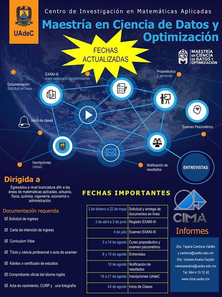 SALTILLO, Coahuila; 20 de mayo de 2020.- El Centro de Investigación en Matemáticas Aplicadas (CIMA) de la Universidad Autónoma de Coahuila, convoca a egresados a nivel licenciatura afín a las áreas de matemáticas aplicadas, física, química, ingeniería, actuaria, economía o administración a ingresar a la Maestría en Ciencia de Datos y Optimización.