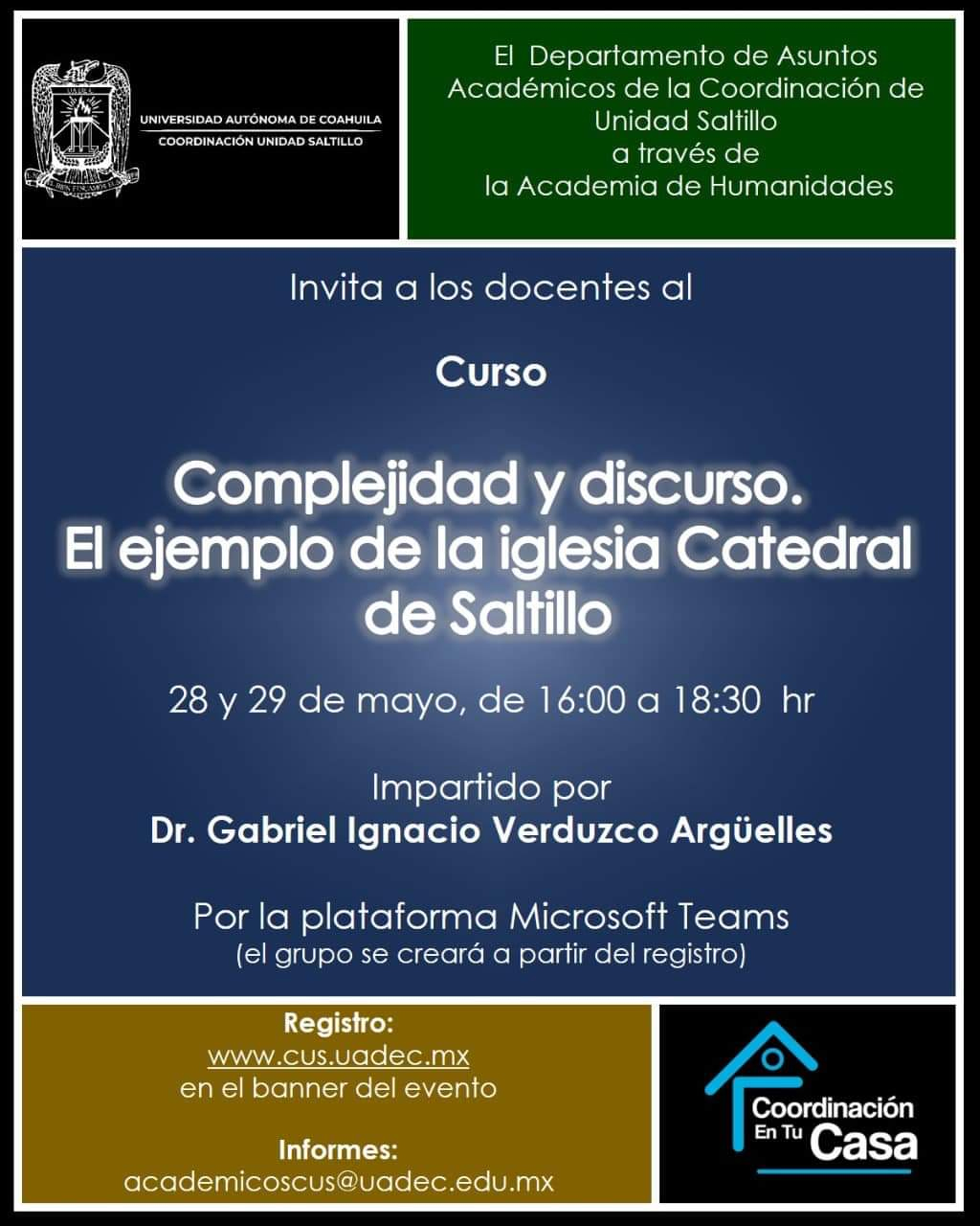 SALTILLO, Coahuila; 26 de mayo de 2020.- A través del Departamento de Asuntos Académicos de la Coordinación Saltillo y la Academia de Humanidades, la Universidad Autónoma de Coahuila invita a maestros al curso "Complejidad y discurso. El ejemplo de la iglesia Catedral de Saltillo".