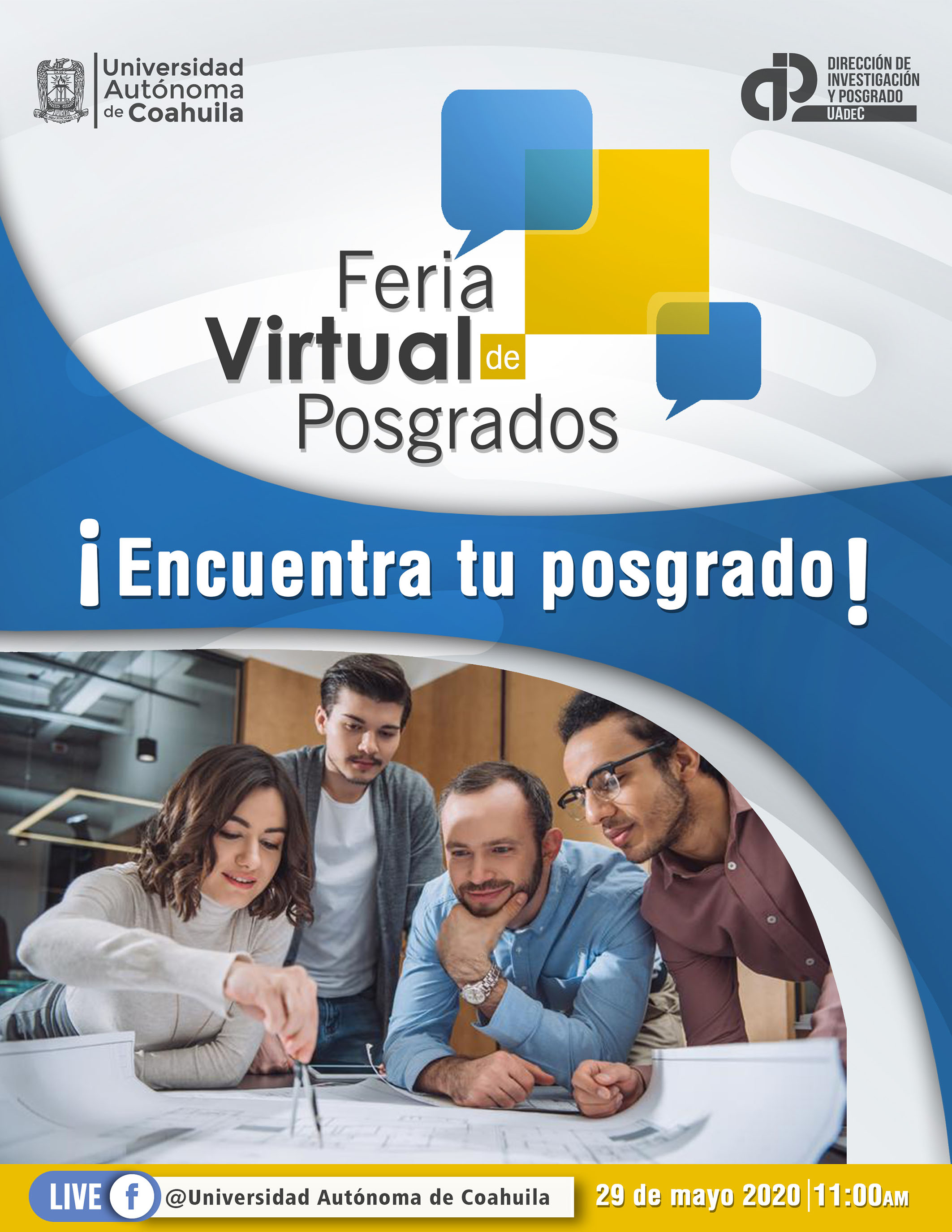 SALTILLO, Coahuila; 27 de mayo de 2020.- Con el objetivo de dar a conocer la oferta académica en maestrías, doctorados y especialidades, la Universidad Autónoma de Coahuila llevará a cabo el próximo viernes 29 de mayo su Segunda Feria Virtual de Posgrado, la cual se realizará de manera virtual través de Facebook.