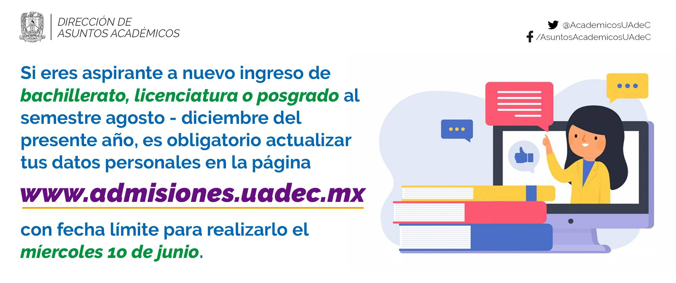 SALTILLO, Coahuila; 8 de junio de 2020.- La Universidad Autónoma de Coahuila informa a los aspirantes de nuevo ingreso a bachillerato, licenciatura o posgrado al semestre agosto-diciembre de 2020, que tienen hasta el 10 de junio para realizar su actualización de datos personales en la página www.admisiones.uadec.mx, siendo este un procedimiento obligatorio para presentar el examen de admisión.