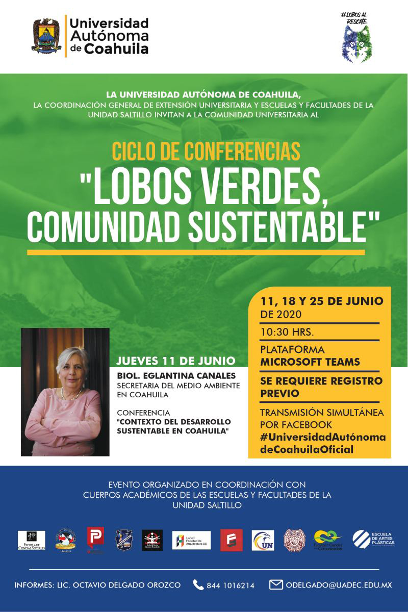 SALTILLO, Coahuila; 9 de junio de 2020.- La Universidad Autónoma de Coahuila, a través de la Coordinación General de Extensión Universitaria, invitan a la comunidad universitaria al ciclo de conferencias en línea "Lobos Verdes, Comunidad Sustentable".