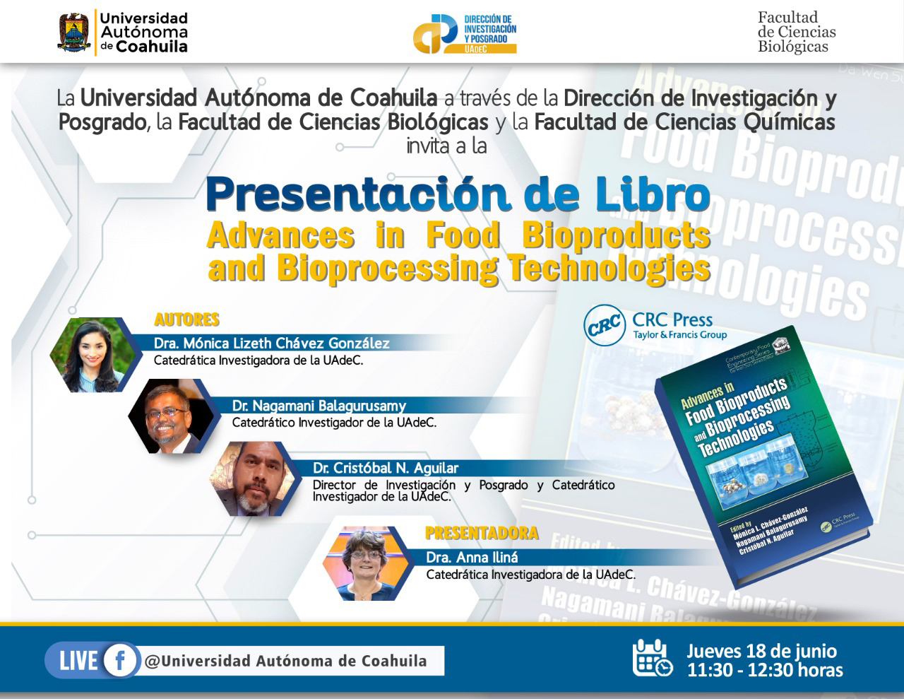 SALTILLO, Coahuila; 15 de junio de 2020.- La Universidad Autónoma de Coahuila a través de la Dirección de Investigación y Posgrado, invitan a la presentación del libro "Advances in Food Bioproducts and Bioprocessing Technologies" el jueves 18 de junio a las 11:30 horas por trasmisión en vivo